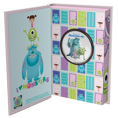 Auf dem Motiv der Silbermünze steht das Mädchen Buh im Monsterkostüm im Vordergrund. Hinter ihr winken der blaue Sully und der grüne Mike. Im Hintergrund dräuen weitere silberne Monstersilhouetten. Ebenfalls koloriert ist der englische Filmtitel Monsters, Inc. ganz oben. Das Sammlerstück hat einen Durchmesser von 40 Millimetern und enthält 1 oz Feinsilber (Feingehalt: 999/1000). Der Münzrand ist geriffelt. Auf der Wertseite ist das Porträt von Königin Elizabeth II. zu finden. Der Nennwert ist mit 2 Dollars angegeben. Ausgabeland ist Niue. Die Verpackung ist wie ein knallbuntes Buch gestaltet. Sie zeigt außen Buhs Kinderzimmer mit dem Schild „Monster verboten“ und innen die Türhalle, über die die Monster in die Kinderzimmer gelangen. Auch ein Echtheitszertifikat ist enthalten.