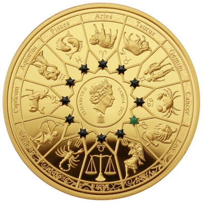 goetter-und-sternzeichen-loewe-zeus-25-g-kupfer-3Umseitig ist rund um das Porträt von Königin Elizabeth II., die das offizielle Staatsoberhaupt des Ausgabelands Samoa ist, der Tierkreis aufgeprägt. Dabei ist über jedem Sternzeichen ein schwarzer Stern platziert, nur der Löwe ist durch einen grünen Stern hervorgehoben. Die Kupfermünze hat einen Durchmesser von 40 Millimetern und ein Gewicht von 25 Gramm (Feingehalt: 999/1000). Sie wird in einem Präsentationsetui ausgegeben, in dem rundum die Symbole der Sternzeichen aufgezeichnet sind. Ganz oben ist dabei der Löwe zu finden.