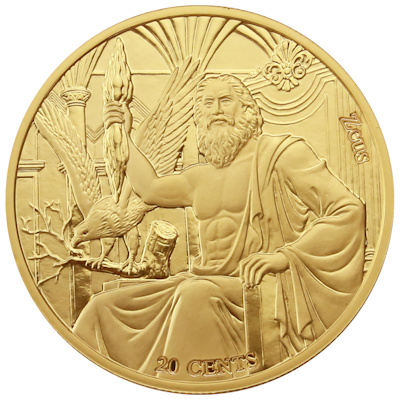 goetter-und-sternzeichen-loewe-zeus-25-g-kupfer-2Der Löwe gilt als besonders selbstbewusstes Sternzeichen. Er ist gern der Chef oder der strahlende Star und lässt sich von anderen bedienen oder hofieren. Welcher antike Gott würde also besser zu ihm passen, als der oberste Olympier, Zeus? Dieser ist auf der Wertseite der Kupfermünze abgebildet. In griechische Gewänder gehüllt und mit entblößter Brust sitzt er auf seinem Thron. In der rechten Hand hält er ein Bündel Blitze, breit, es auf die Erde zu schleudern. Der lange Bart gibt ihm ein reifes, erfahrenes Aussehen. Neben dem Göttervater sitzt ein Adler auf einem Ast. Unten ist der Nennwert von 20 Cent aufgeprägt.