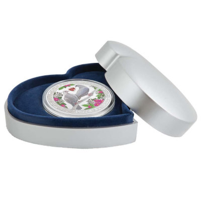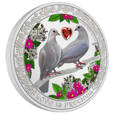 Weitere Blüten sind auf dem Rahmen um das farbige Motiv zu finden, auf dem auch der Titel „Love is Precious“ zu lesen ist. Die Silbermünze ist in höchster Proof-Qualität geprägt und enthält 1 oz Feinsilber (Feingehalt 999/1000). Sie hat einen Durchmesser von 40 Millimetern und einen geriffelten Rand. Als offizielles Zahlungsmittel von Niue zeigt sie auf der Wertseite das Porträt von Königin Elizabeth II. Der Nennwert ist mit zwei Dollars angegeben. Abgerundet wird das Gesamtpaket durch das herzförmige Etui und den liebevoll gestalteten Shipper mit stilisierten Tauben. Sogar das nummerierte Echtheitszertifikat steht ganz im Zeichen der Liebe und ist mit einem Zitat des italienischen Schriftstellers und Librettisten Arrigo Boito versehen: „When I saw you, I fell in love, and you smiled because you knew.“ (Als ich dich sah, verliebte ich mich und du lächeltest, weil du es wusstest.)