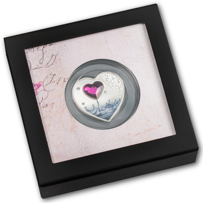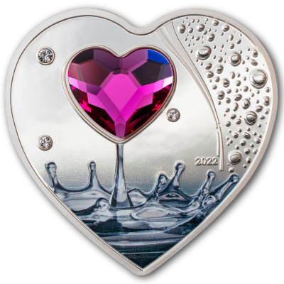 valentinstag-2022-1-oz-silber-swarovskiWie ein Tropfen aus einem See von Liebe steigt das rubinrote Kristallherz auf der Silbermünze zum Valentinstag 2022 zwischen funkelnden Tropfen empor. Nur 2.022 Exemplare sind von diesem romantischen Sammlerstück zu haben. Neben den funkelnden Swarovski-Elementen macht die Herzform diese Münze aus 20 Gramm Feinsilber zur idealen Geschenkidee für die Romantiker unter den Numismatik-Fans.