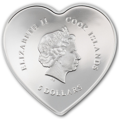 valentinstag-2022-1-oz-silber-swarovski-wertseiteDas Silberherz ist 37 mal 37 Millimeter groß und in der höchsten Prägequalität Polierte Platte hergestellt. Der Feingehalt liegt bei 999/1000. Die Wertseite zeigt das Porträt von Königin Elizabeth II., die das offizielle Staatsoberhaupt des Ausgabelands Cook Islands ist. Der Nennwert ist mit 5 Dollars angegeben. Verpackt ist die Silbermünze in ein Etui mit durchsichtigem Deckel, damit es sich schön präsentieren lässt. Außerdem gibt es eine Umverpackung ein nummeriertes Echtheitszertifikat dazu.