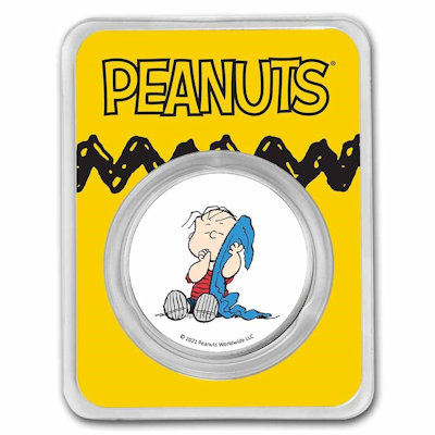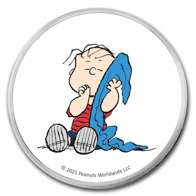 Ein Philosoph mit Kuscheldecke: Unter den Peanuts-Figuren hat kaum einer einen größeren Wiedererkennungswert als Linus Van Pelt. Das liegt natürlich vor allem daran, dass er fast nie ohne seine blaue Decke zu sehen ist. Sie darf deshalb auf der Silberprägung in der Serie zum Jubiläum 70 Jahre Peanuts natürlich nicht fehlen. Auch Charlie Brown, Snoopy und Linus‘ große Schwester Lucy sind auf Silber zu haben.