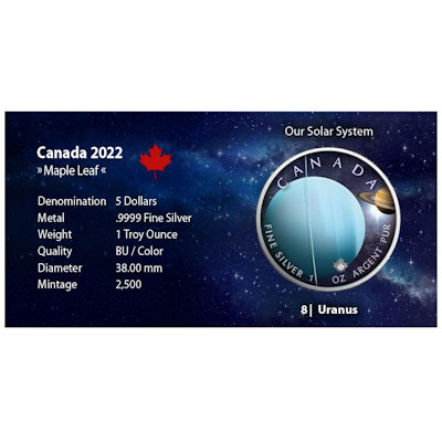 Durch das Ringsystem ist die gekippte Rotationsachse des Uranus auf dem Motiv der Silbermünze sichtbar. Es steht rechtwinklig zu dem des Saturn, der im Hintergrund abgebildet ist. Unten findet man das typische Ahornblatt der Anlagemünze Maple Leaf in einer verkleinerten Variante. Die Wertseite zeigt das Susanna-Blunt-Porträt von Königin Elizabeth II. über dem Nennwert von 5 CAD. Der Münzrand ist geriffelt. Das Sammlerstück enthält 1 oz Feinsilber bei einem Feingehalt von 99,99 Prozent und hat einen Durchmesser von 38 Millimetern. Die Silbermünze ist in Stempelglanz-Qualität geprägt und wird mit einer Produktkarte ausgegeben, die alle Planeten des Sonnensystems auf ihren Umlaufbahnen zeigt.
