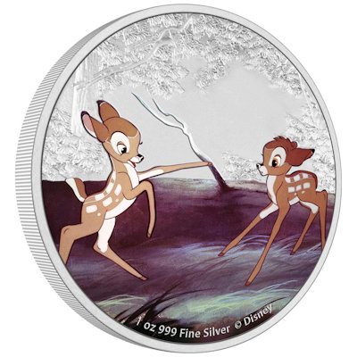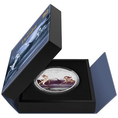 80-jahre-bambi-feline-1-oz-silber-koloriert80 Jahre ist der Disney-Klassikers Bambi schon alt. Die New Zealand Mint feiert den Film deshalb mit einer Serie von Silbermünzen, auf denen einige der bekanntesten Szenen abgebildet sind – etwa Bambi und Klopfer sowie Bambi und Blume. Da darf natürlich auch Feline nicht fehlen! Das Sammlerstück mit den beiden jungen Rehen ist jetzt zu haben. Die Auflage ist auf nur 1.942 Exemplare limitiert.