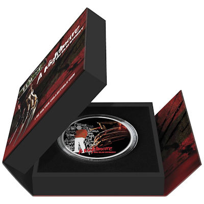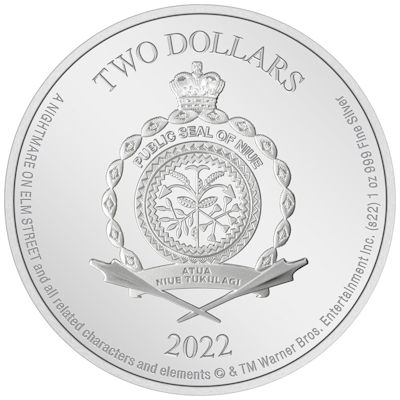 Auch die Silbermünze setzt auf diese markanten Erkennungszeichen, wobei der gestreifte Pullover sich von der silbernen Silhouette des Mörders abhebt. Der Handschuh mit den messerscharfen Klauen ist im Vordergrund noch einmal zu sehen. Der Titel des Films ist natürlich in Blutrot gehalten. Die in höchster Proof-Qualität geprägte Silbermünze hat einen Durchmesser von 40 Millimetern und einen geriffelten Rand. Sie enthält 1 oz Feinsilber (Feingehalt 999/1000). Die Wertseite zeigt das offizielle Siegel des Ausgabelands Niue unter dem Nennwert von 2 Dollars. Ausgegeben wird das Sammlerstück mit dem geriffelten Rand gekapselt, in einem passenden Etui und mit nummeriertem Echtheitszertifikat.