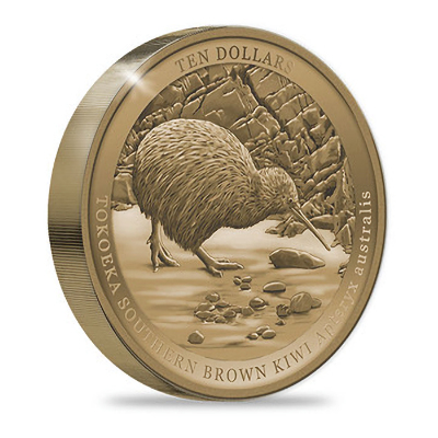 Der Kiwi auf dem Münzmotiv ist dennoch allein unterwegs. Am Strand hält er zwischen Sand und Felsen nach Futter Ausschau. Der Name „Tokoeka Southern Brown Kiwi“ ist randläufig aufgeprägt. Die Goldmünze hat einen Durchmesser von 26,00 Millimetern und enthält 1/4 oz Feingold bei einem Feingehalt von 99,99 Prozent. Oben ist der Nennwert von 10 Neuseeland-Dollars verzeichnet. Der Münzrand ist geriffelt. Umseitig zeigt das Sammlerstück das Porträt von Königin Elizabeth II. Die in der höchsten Prägequalität Polierte Platte hergestellte Goldmünze wird gekapselt und verpackt in ein stilvolles schwarzes Etui ausgegeben. Ein nummeriertes Echtheitszertifikat gehört ebenfalls dazu.