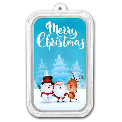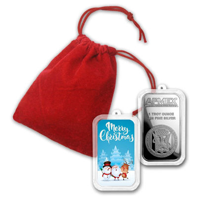 Ausgegeben wird der kolorierte Motivbarren von APMEX, wie umseitig zu sehen ist. Er enthält 1 oz Feinsilber bei einem Feingehalt von 999/1000 und ist 50 mal 29 Millimeter groß. Die Prägung erfolgt in Stempelglanz-Qualität. Eingebettet in eine Kapsel mit Schlaufe lässt sich der Silberbarren leicht in ein weihnachtliches Deko-Objekt verwandeln. Außerdem ist er in ein Samtsäckchen verpackt, das natürlich in festlichem Rot gehalten ist. Dieses Gesamtpaket macht den Motivbarren zu einer hübschen Geschenkidee. Wer allerdings eine runde Sache bevorzugt, hat dieses Jahr zum Beispiel die Silbermünze Maple Leaf Merry Christmas oder die Silbermünze Herrnhuter Stern aus Deutschland zur Wahl.