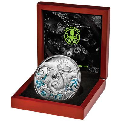Berichte über riesige Kraken brachten Seefahrer schon jahrhundertelang mit nach Hause. Sie wurden jedoch bis Mitte des 19. Jahrhunderts nicht ernst genommen. Inzwischen weiß man, dass es sich bei den teils über zehn Meter langen Giganten der Tiefsee um Riesenkalmare handelt. Dass diese jedoch Schiffe angreifen und zerstören würden, gehört wirklich ins Reich der Legenden. So darf auch das Motiv der Silbermünze der Fantasie zugeschrieben werden. Hier umfängt der mythische Kraken mit seinen langen Armen ein Wikingerschiff und hat es schon fast komplett unter Wasser gezogen. Die Prägung in High Relief und das schäumende, blau kolorierte Wasser verleihen der Szene zusätzliche Dynamik.