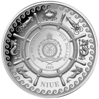 Die Silbermünze hat einen Durchmesser von 55 Millimetern und einen geriffelten Rand. Sie enthält 2 oz Feinsilber bei einem Feingehalt von 999/1000. Die Wertseite zeigt das Siegel des Ausgabelands Niue und den Nennwert von 5 Dollars im Mittelpunkt eines Steuerrads. Zwischen den Griffen sind weitere Wassergeschöpfe aufgeprägt, ganz oben etwa ein Krebs, mittig links und rechts je eine Meerjungfrau. Stilisierte Wellen rahmen das Motiv ein. Das in der höchsten Prägequalität Polierte Platte gefertigte Sammlerstück wird in einem passenden Etui und einer Umverpackung, die die Tentakel des Kraken in Szene setzt, ausgegeben. Ein Echtheitszertifikat gehört dazu.
