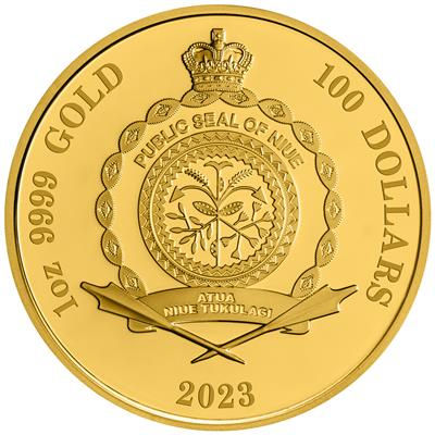 deadly-and-dangerous-tiger-shark-1-oz-gold-koloriert-wertseiteDie Goldmünze lässt den Betrachter wie durch das Maul eines Hais auf die Szene blicken. Eingerahmt von spitzen Zähnen zeigen sich drei Tigerhaie: ein koloriertes Exemplar mit aufgerissenem Maul ist im Vordergrund zu sehen, dahinter schwimmt ein goldener Hai, der dritte zeigt sich als ominöser Schatten nahe der Wasseroberfläche. Das in höchster Proof-Qualität geprägte Sammlerstück enthält 1 oz Feingold bei einem Feingehalt von 99,99 Prozent. Es hat einen Durchmesser von 38,6  Millimetern und einen geriffelten Rand. Auf der Wertseite findet man das offizielle Siegel des Ausgabelands Niue. Der Nennwert ist mit 100 Dollars angegeben. Die Tigerhai-Goldmünze wird in einem stilvollen Holzetui und einem goldenen Shipper ausgegeben. Ein nummeriertes Echtheitszertifikat gehört dazu.