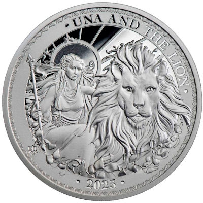 una-and-the-lion-2023-1-oz-silber-pp-2Una ist eine Figur aus dem epischen Gedicht „The Fairie Queen“ von Edmund Spenser. Dieser war der Dichterfürst des elisabethanischen Zeitalters. Die keusche Königstochter Una begegnet bei einer Rast einem Löwen, der sie jedoch nicht frisst, sondern betört wird von ihrer Reinheit. Denn, so Spenser, Schönheit besiege den Stärksten. Una ist dabei die Verkörperung der anglikanischen Kirche – und damit der wahren Kirche, im Unterschied zur „falschen“ katholischen. Nachdem Heinrich VIII. die Reformation durchgesetzt hatte und seine Tochter Mary in den Schoß der Kirche zurückgekehrt war, wurde England unter Elizabeth I. endgültig protestantisch. Das Münzmotiv zeigt die langhaarige Königstochter Una im Gras sitzend. Der Löwe liegt brav wie ein Lamm neben ihr. Im Hintergrund strahlt die Sonne. Randläufig ist der Titel Una and the Lion verzeichnet.