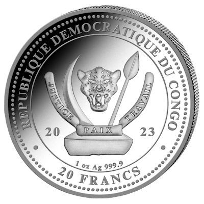 world-s-wildlife-rochen-1-oz-silber-koloriert-wertseiteDer Name der Serie schließt das Münzmotiv unten ab. Die Silbermünze hat einen Durchmesser von 38,60 Millimetern und einen Feingehalt von 99,99 Prozent. Sie enthält 1 oz Feinsilber. Der Münzrand ist geriffelt. Geprägt in Stempelglanz-Qualität und aufwendig koloriert kommt sie einzeln gekapselt zum Münzsammler. Die Wertseite zeigt das Wappen des Ausgabelands Kongo. Elemente sind ein Stoßzahn, ein Leopardenkopf und ein Speer. Darunter ist der Nennwert von 20 Francs aufgeprägt.