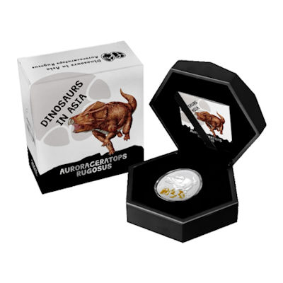 Ob Tyrannosaurus, Brontosaurus, Stegosaurus oder Ankylosaurus, viele der bekanntesten Dino-Arten wurden in Nordamerika entdeckt. Doch die Urzeitechsen gab es auch auf anderen Kontinenten. Eine besonders schön gestaltete Serie von Silbermünzen widmet sich den Dinosauriern in Asien. Mit ihrer besonderen Form und der Teilvergoldung sind sie in Blickfang – das gilt natürlich auch für die Ausgabe Auroraceratops rugosus, von der 3.000 Exemplare zu haben sind.