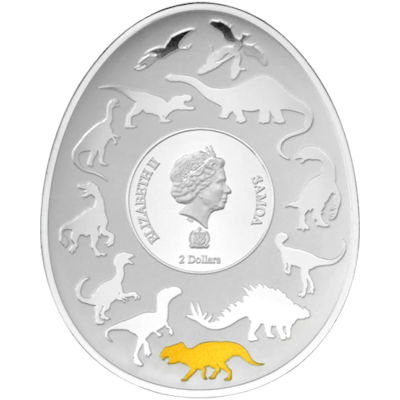 Die Silbermünze hat die Maße von 50 mal 40 Millimetern. Sie enthält 1 oz Feinsilber bei einem Feingehalt von 999/1000 und ist in der höchsten Prägequalität Polierte Platte gefertigt. Die Wertseite zeigt das Porträt von Königin Elizabeth II. Unter ihr ist der Nennwert von 2 Dollars angegeben, seitlich das Ausgabeland Samoa. Rundherum sind alle Dinos der Serie dargestellt, wobei ganz unten der vergoldete Auroraceratops heraussticht. Die Sammlerstücke werden in einem sechseckigen Etui, mit Echtheitszertifikat und Umverpackung ausgegeben.