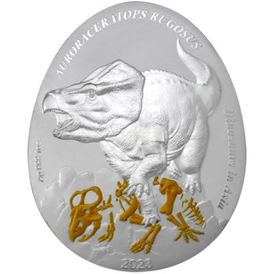 Im Vergleich zu den oben genannten Berühmtheiten war Auroraceratops rugosus eher ein Winzling, etwa 1 1/4 Meter lang und nicht einmal einen halben Meter hoch. Die Forschung weiß das recht genau, denn von diesem Dino liegt fast das gesamte Skelett vor. Die Tiere lebten in der Zeit der Unterkreide, also vor rund 126 bis 113 Millionen Jahren, im heutigen China. Der Name zeigt die Verwandtschaft mit dem bekannteren Triceratops, mit dem sie den Hornschild am Kopf gemeinsam haben. Auf dem Motiv der Silbermünze, die die Form eines Dino-Eis hat, ist eine Darstellung des Pflanzenfressers zu sehen, wie er ausgesehen haben könnte. Zu seinen Füßen ist der Skelettfund aufgeprägt, der durch die Vergoldung hervorgehoben wird.