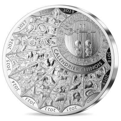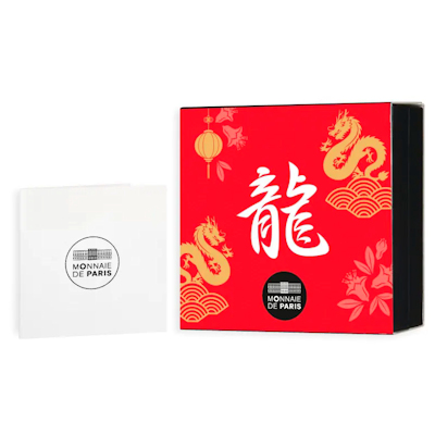 Während die Royal Canadian Mint auf Niedlichkeit setzt und die Perth Mint dem Drachen als Beherrscher der Elemente huldigt, betonen die Designer der Monnaie de Paris die Schlangennatur des asiatischen Fabelwesens. In S-Form windet sich der Leib des Tiers dem Betrachter entgegen, vorangeschoben von der Adlerklaue, die unten zu sehen ist. Natürlich trägt der Drache der althergebrachten Vorstellung entsprechend auch Geweih und Mähne. Direkt auf seiner Schuppenhaut wurde das chinesische Schriftzeichen für Drache platziert. Umgeben ist das Fabeltier von zwei Kreisen, deren Gestaltung von der traditionellen chinesischen Kunst inspiriert ist. Auf dem inneren sind verschiedene Lunar-Zeichen zu entdecken, links etwa der Tiger, rechts Hahn und Affe.