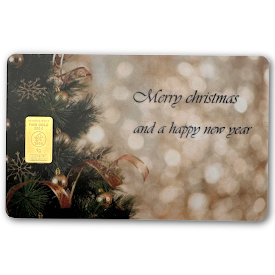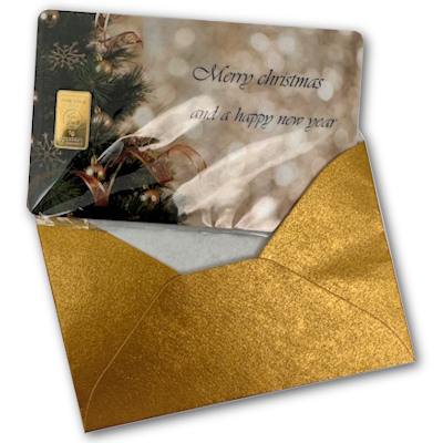 Merry cristmas and a happy new year – frohe Weihnachten und ein gutes neues Jahr, diese Botschaft verschicken viele auf Weihnachtskarten. In manchen davon steckt vielleicht Geld, die FineCard kommt dagegen mit einem Goldbarren. Dieser bleibt bei einem Gramm erschwinglich und bietet doch eine wertbeständige Anlage für den Beschenkten. Das Motiv zeigt einen stilvoll gestalteten Christbaum. Umseitig ist zudem noch Platz für eine kleine Botschaft. Hier lässt sich zum Beispiel vermerken, von wem das Geschenk kommt. Ein goldener Umschlag rundet das Gesamtpaket ab.