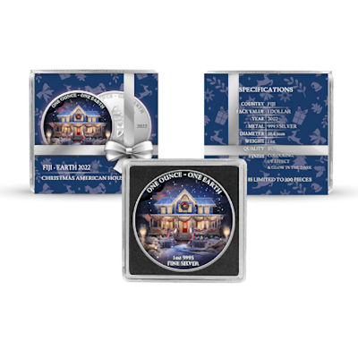 Funkelnde Lichterketten rund ums Dach, beleuchtete Rentiere, ein Schlitten mit Santa Claus – was die Weihnachtsdeko angeht, kann niemand mit den Amerikanern mithalten. Da kommt das festlich dekorierte Haus auf dieser Silbermünze fast noch dezent daher. Tief verschneit und hell erleuchtet verbreitet es Weihnachtsstimmung und strahlt auch noch im Dunkeln. Die Auflage des Sammlerstücks ist auf nur 300 Exemplare limitiert.