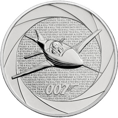 Bis Mitte der 80er wurde James Bond von Roger Moore gespielt. Er sitzt auch am Steuer des Acrostar Bede Jet, der auf dem Münzmotiv zu sehen ist. Verfolgt von einer Rakete, beweist der Geheimagent in dieser Sequenz wieder einmal Nerven aus Stahl. Er vollführt einige Kunststücke mit dem Kleinstflugzeug, manövriert es durch die sich schließenden Türen eines Hangars und sorgt damit für eine Explosion. Auf der Silbermünze fliegt er aus den Filmtiteln im Hintergrund heraus über das 007-Logo hinweg. Eingerahmt ist die Szene, wie beim Vorspann der Bond-Filme, von einem Pistolenlauf.