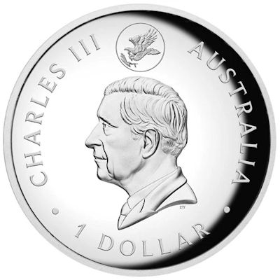 Der Wedge-Tailed Eagle leuchtet auf dem Münzmotiv golden vor einem Strahlenhintergrund. Am Rand entlang sind der Name und der Hinweis auf das Jubiläum verzeichnet. Die in Hochrelief geprägte Silbermünze hat einen Durchmesser von 32,60 Millimetern und enthält 1 oz Feinsilber bei einem Feingehalt von 999,9/1000. Der Münzrand ist geriffelt. Die Wertseite zeigt das Porträt von König Charles III. Über seinem Scheitel ist das Motiv der ersten Ausgabe der Bullionmünze aufgeprägt. Der Nennwert liegt bei einem australischen Dollar. Das Sammlerstück wir in einem passenden Etui und einer Umverpackung ausgegeben. Ein Echtheitszertifikat gehört dazu.