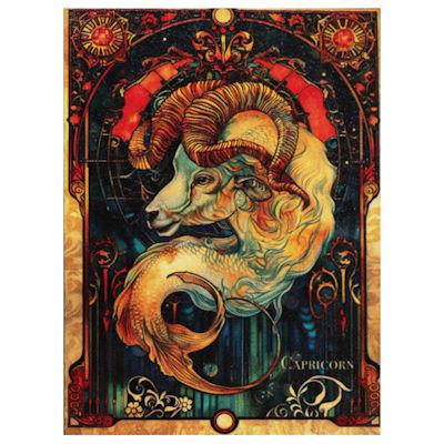 Passend zum Sternbild ist der Steinbock auf dem Motiv der Silbermünze als Ziegenfisch dargestellt: Zum Kopf mit den kunstvoll gedrehten Hörnern gesellt sich ein Fischschwanz. Rechts unten ist der englische Name Capricorn verzeichnet. Der Stil ist an den des Jugendstil-Künstlers Alphonse Mucha angelehnt. Die Wertseite zeigt das Porträt einer Frau im Profil, um das die Tierkreiszeichen angeordnet sind. Der Nennwert von 500 Francs ist oben angegeben. Kamerun ist das Ausgabeland. Die Silbermünze enthält 1/2 oz Feinsilber bei einem Feingehalt von 999/1000. Sie ist 99 mal 73 Millimeter groß und wird in einem Acryl-Display, mit Umverpackung und Echtheitszertifikat ausgegeben.