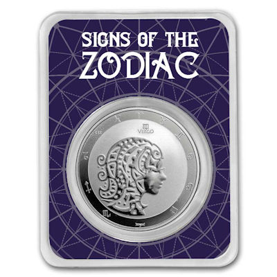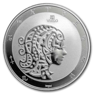 In der Silbermünzen-Serie Signs of the Zodiac hat die Jungfrau natürlich eine eigene Ausgabe. Diese zeigt das stilisierte Bild einer jungen Frau im Profil unter dem Symbol für das Sternbild, das an ein M erinnert. Ringsum sind alle zwölf Zeichen des Zodiaks angeordnet. Die Entsprechung des Sternzeichens am Nachthimmel ist das Sternbild Virgo. Dessen hellster Stern, Spica, wird als die Kornähre in der Hand der Jungfrau interpretiert. Das Sternbild wurde außerdem mit dem Mythos der Kore in Verbindung gebracht: Die Tochter der Götting Demeter wurde von Hades in die Unterwelt verschleppt, wo sie den Namen Persephone erhielt.