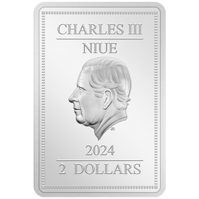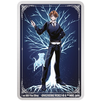 harry-potter-patronus-ron-1-oz-silber-koloriert-wertseiteDas Motiv der Silbermünze zeigt den geisterhaften Hund an Rons Seite. Ron ist natürlich an den roten Haaren zu erkennen. Die Metallic-Farben und der ornamentale Rahmen machen das Bild zu einem Blickfang. Die Wertseite zeigt das Porträt von König Charles III. von Jody Clark. Das Ausgabeland ist Niue. Der Nennwert ist mit 2 Dollars angegeben. Der Silberbarren aus 1 oz Feinsilber ist 53 mal 36 Millimeter groß und hat einen Feingehalt von 999/1000. Er wird er gekapselt und mit Echtheitszertifikat ausgegeben. Das Etui mit Sichtfenster ist so gestaltet wie bei anderen beliebten Ausgaben aus der zauberhaften Welt von Harry Potter.