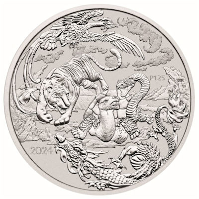 Stilisierte Berge und Wolken bilden den Hintergrund für die vier glückverheißenden Tiere. Neben der Schlange findet man das Mintmark, das im Jubiläumsjahr der Perth Mint um die Zahl 125 ergänzt ist. Neben dem Kopf des Drachen ist die Jahreszahl aufgeprägt. Die Silbermünze enthält 1 oz Feinsilber bei einem Feingehalt von 99,99 Prozent. Der Münzrand ist geriffelt. Der Durchmesser beträgt 40,90 Millimeter. Die Wertseite zeigt das Porträt von König Charles III. von Dan Thorne. Der Nennwert liegt bei einem Dollar, Ausgabeland ist Australien. Die in Stempelglanz geprägten Münzen werden gekapselt ausgegeben.