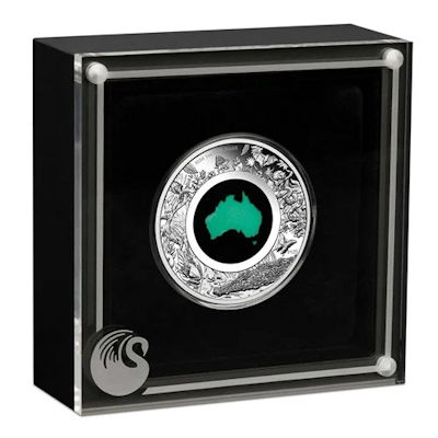 great-southern-land-2024-1-oz-silber-chrysoprasAus Opal, aus Perlmutt oder aus Lepidolith: Auf der Silbermünze Great Southern Land präsentiert die Perth Mint den australischen Kontinent aus wechselndem Material. Bei der Ausgabe 2024 ist es grüner Chrysopras, der an Australiens Regenwälder erinnern soll. Umgeben ist der Schmuckstein von einem Rahmen, der einheimische Flora und Fauna zeigt. Das Sammlerstück hat eine limitierte Auflage von 5.000 Exemplaren.