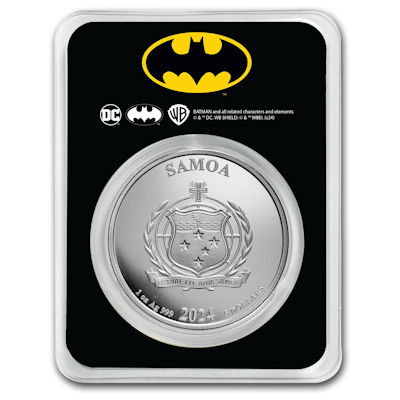 Auch auf der Blisterverpackung, die natürlich in DC-Blau gehalten ist, ist Batman abgebildet. Umseitig zeigt die Silbermünze das Wappen des Ausgabelands Samoa: Der Wappenschild trägt das Sternbild Kreuz des Südens, darüber sind Meereswellen und eine Kokospalme mit goldenen Früchten zu sehen. Unten ist am Rand der Nennwert von 5 Dollars verzeichnet. Das Sammlerstück enthält 1 oz Feinsilber bei einem Feingehalt von 999/1000. Es ist in Stempelglanz-Qualität geprägt und hat einen Durchmesser von 39,0 Millimetern.