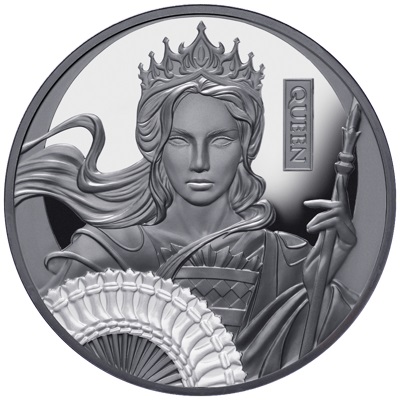 Im Deutschen wird sie bescheiden Dame genannt, hier tritt sie unter ihrer weiter eindrucksvolleren englischen Bezeichnung Queen auf: Die mächtigste Figur im Schachspiel ist kein Krieger, nicht einmal der König, nein: Es ist die Frau an dessen Seite. Natürlich ist ihr auch eine Ausgabe in der Schach-Silbermünzen-Serie gewidmet. Die Prägung in Black Proof lässt die Figur geheimnisvoll erscheinen. Die Auflage ist auf 999 Exemplare limitiert.