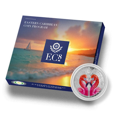 ec8-flamingos-1-oz-silber-koloriertKaribische Strände, spektakuläre Berge, Wasserfälle im Regenwald: St. Lucia ist ein karibischer Urlaubstraum –  und eine von acht Inseln, die in der Eastern Caribbean-Serie auf Silbermünzen präsentiert werden. Die Münzen werden von der Eastern Caribbean Central Bank ausgegeben und von der Scottsdale Mint geprägt. Mit Kolorierung hat das Sammlerstück eine limitierte Auflage von nur 500 Exemplaren.