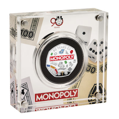 So kann man bei der Royal Mint Besitzer von Mayfair oder Trafalgar Square statt von Parkstraße oder Schlossallee werden. Neben den Spielkarten sind auf dem Motiv Häuser, Würfel und Figuren zu sehen. Auch das Bügeleisen, das seit einiger Zeit nicht mehr zu den Spielsteinen gehört, ist dabei. Im Mittelpunkt stehen das Monopoly-Logo und Mister Monopoly, das schnurrbärtige Männchen mit Hut und Geldsack unterm Arm. Rechts unten findet man noch ein besonderes Feld: Das Kippbild zeigt je nach Bewegung der Münze das Startfeld oder das Geld-Symbol. Oben ist der Hinweis auf den 90. Geburtstag des Spiels integriert. Das siebeneckige Sammlerstück aus 8 Gramm Silber hat einen Durchmesser von 27,30 Millimetern und einen Feingehalt von 925/1000. Umseitig zeigt es das Porträt von König Charles III. Der Nennwert ist mit 50 Pence angegeben. Das Etui ist mit Würfeln und Monopoly-Geldscheinen dekoriert. Ein Echtheitszertifikat gibt es auch noch dazu.