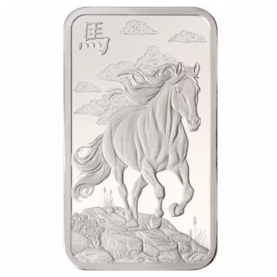 Dazu passt das Bild auf dem Motiv des Silberbarrens: Es zeigt ein Pferd in vollem Lauf, ungebändigt und frei. Das passende chinesische Schriftzeichen ist oben links zu finden. Der Barren enthält 1 oz Feinsilber. Umseitig zeigt er den Mond, um den zwölf Sterne angeordnet sind, die für die zwölf Tierkreiszeichen stehen. Das Silberstück ist 27 mal 47 Millimeter groß. Es hat einen Feingehalt von 999/1000 und wird in einer leuchtend roten Blisterverpackung ausgegeben.