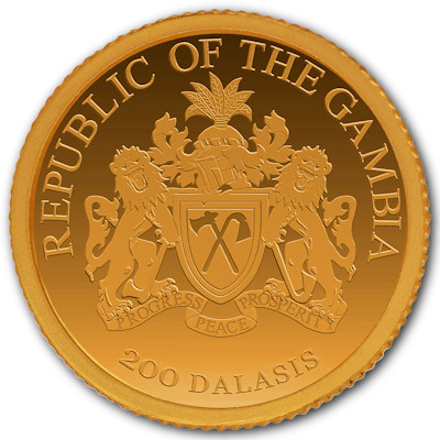 Die Goldmünze zeigt eine Porträt der jungen Königin Elizabeth. Das kleine Goldstück enthält 1/100 oz Feingold und hat dabei den relativ großen Durchmesser von 14,0 Millimetern. Der Feingehalt liegt bei 999,9/1000. Der Nennwert ist mit 200 Dalasi angegeben. Die Wertseite zeigt das Wappen des Ausgabelands Gambia: Zwei Löwen halten einen Schild, auf dem zwei gekreuzte landwirtschaftliche Geräte abgebildet sind, eine Axt und eine Hacke. Auf dem Schild ruht ein Helm, der von einem Erdnussstrauch gekrönt wird.