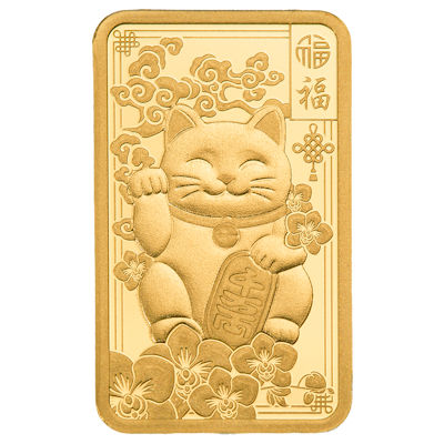 Die Katze auf dem Motiv hat die typisch rundlichen Formen und die aufrechte Haltung einer Winkekatze. Der Goldbarren ist 11,5 mal 19 Millimeter groß. Er hat einen Feingehalt von 999,9/1000 und enthält 2,5 g Feingold. Die Wertseite ist mit Blüten und stilisierten Wolken im asiatischen Stil dekoriert. Die wertvolle Geschenkidee wird in einer roten Blisterverpackung ausgegeben, die das Gold wunderbar strahlen lässt. Ein Zertifikat gehört dazu. Wenn es ein kleineres Geschenk sein soll, sind vielleicht die Sternzeichen-Goldbarren der PAMP Suisse das Richtige.