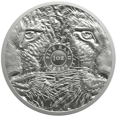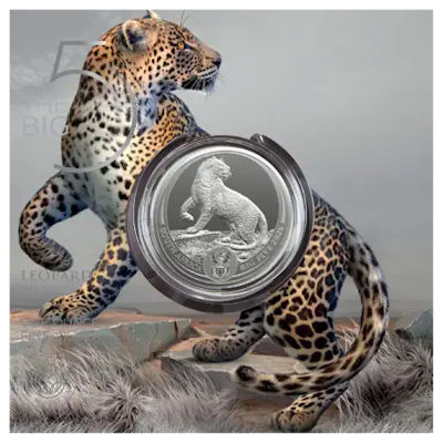 Die Silbermünzen-Serie Big Five zeigt den Leoparden als stolzes Wildtier. Das Motiv gibt seinen kräftigen Körperbau und die markanten Flecken gut wieder. Unten ist mittig das Wappen Südafrikas platziert. Die Wertseite zeigt zwei halbe Leopardenköpfe, die man mit weiteren Silbermünzen zu einem Ganzen komplettieren kann. In der Mitte ist die Nennwertangabe von 5 Rand platziert. Außerdem sind das Gewicht von 1 oz Feinsilber und der Feingehalt von 999/1000 hier angegeben. Die Silbermünze hat einen Durchmesser von 38,73 Millimetern und einen geriffelten Rand. Die Karte, in der die gekapselte Silbermünze geliefert wird, greift das Münzmotiv auf.